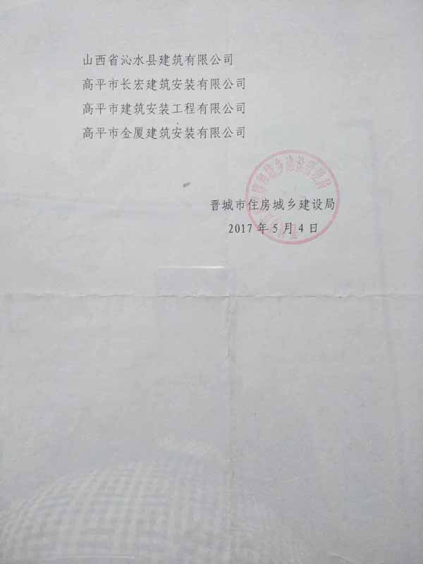 2017年5月4日,接晉城市住房城鄉(xiāng)建設(shè)局有關(guān)通知,晉城市金建建筑有限公司入選2017年晉城市骨干建筑業(yè)企業(yè)名單。2017年晉城市骨干建筑業(yè)企業(yè)自公布之日起,“骨干建筑業(yè)企業(yè)”稱號(hào)有效期一年。今后,每年評(píng)選一次,每年****季度評(píng)選完成,“骨干建筑業(yè)企業(yè)”稱號(hào)有效期一年。